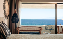 De 122 stijlvolle kamers, suites en bungalows zijn elegant, lichtdoorstroomd en ontworpen in warme natuurtinten. Hoogwaardige materialen en strakke lijnen zorgen voor een moderne, comfortabele sfeer. Veel wooneenheden hebben een terras of balkon met zeezicht, sommige suites beschikken over een privé of gedeeld zwembad. Eenpersoonskamers zijn tweepersoonskamers voor alleengebruik.